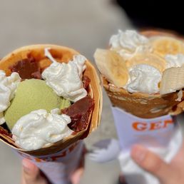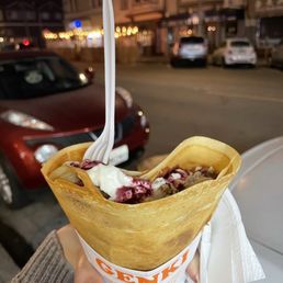 Genki is my all time favorite dessert place in SF! Luckily, they close around midnight most days so my late night crepe cravings get satisfied. They're located in the Inner Richmond district and I usually find easy parking in this area, which is a huge plus. Genki Crepes is located inside of a cute mini-mart so you can peruse cool items they have in stock while waiting for your crepe. Service for ordering is usually quick even if the line is long. My go-to order is always the #1 with vanilla ice cream and strawberries topped with whipped cream. Crepes always come out soft and crispy and pairs nicely with the vanilla ice cream and fresh strawberries. Their whipped cream is my favorite part of the crepe as it tastes super creamy and I think they make it in store as well. If you're in the area, definitely come check this place out!